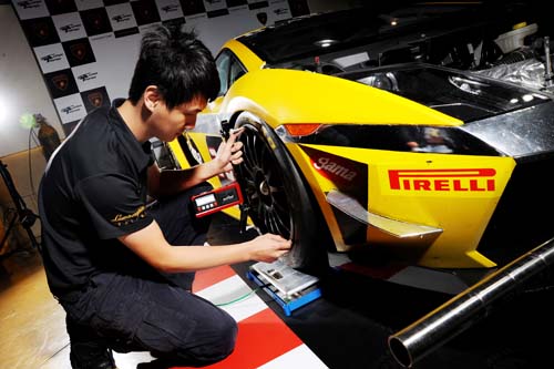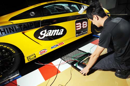 本次嘉鎷興業將Lamborghini Blancpain?Super Trofeo比賽車輛運回台灣,除展示車輛外,更邀請參與賽事巡迴的專屬技師,於現場示範車輛各項定位設定,展現維修團隊專業技術。首先,車輛進行設定時會於車輛前後裝置水平桿,並配合魚線,藉此即可測量出各車輪左右對應距離,便能進行Toe in及Toe out等束角設定。至於Camber方面,利用測量儀器,能立即測量出各車輪傾角角度,藉由改變傾角角度,增加或減少循跡設定,進而改變車輛於彎道中反應。車身配重,利用電子秤重儀及懸吊調整,將車身重量平均分配,以利車輛於賽道表現。另外,該車配置氣壓式千斤頂,能快速將車輛頂起,讓維修團隊能快速進行更換車輪及底盤等各項設定。由於Lamborghini Blancpain?Super Trofeo為統一規格賽,所有車輛的規格皆相同,因此比賽表現除靠駕駛本身技術外,維修團隊的調校功力及默契,更是比賽的致勝關鍵,這也讓比賽的緊張度及刺激度更為激烈。彭郁儒