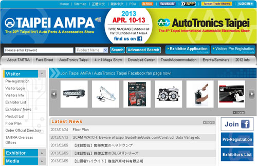 由中華民國對外貿易發展協會主辦的「第29屆台北國際汽車零配件展」及與台灣區電機電子工業同業公會共同舉辦之「第8屆台北國際車用電子展」將於2013年4月10日至13日在台北世貿中心南港展覽館及世貿一館A區盛大展出,屆時將有1,100家廠商參加,展出規模首度突破3,000個攤位,相較上屆成長6%,並首度聯合「台灣國際機車展」、「台灣國際電動車展」同檔期舉行,是全球汽車零配件相關人士不容錯過之年度展覽盛會!