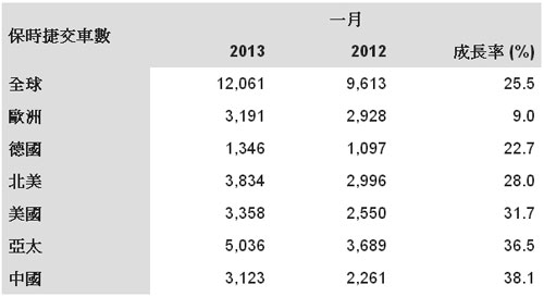 保時捷在2013年1月份全車系全球交車數量為12,061台,較去年同期成長25.5%。