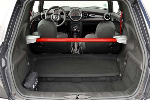 | Mini JCW GP使用一根強化車身剛性的結構桿來取代後座,車身重心點也因此而有了些微改變。 |
