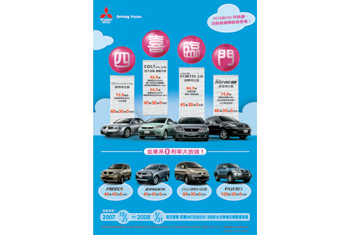 想要在年底換車的消費者千萬不要錯過MITSUBISHI「四喜臨門」年終慶,超值優惠專案還有全車系零利率活動,別猶豫,現在就趕快到MITSUBISHI全省展示中心一同歡度年終慶!