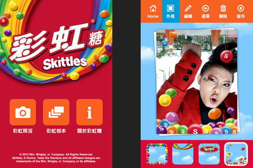 Skittles彩虹糖再出奇招,高呼「顛倒彩虹,吃一口彩虹」!今年開春即首度結合時下最流行的手機APP軟體,推出「Skittles彩虹照反相機」應用程式,使用者只要擺出翹臂下腰的搞怪姿勢,就可以用APP拍出反照。APP也提供數款Skittles相框及經典的彩虹糖粒讓使用者編輯,創造獨特風格、趣味無窮的「彩虹照反照」。無論你倒著照或反著照,拍出來越不正的越正,越反越讚,甫上市就深受愛照相、愛搞怪的使用者喜愛,爭相下載。