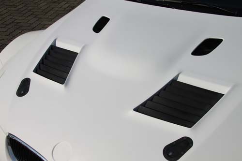 從外觀上可以明顯看到相較於原廠M3運動化的車身線條,由德國Robert Senkyr Motorsport所開發的碳纖維空力外觀完全比照GT2廠車式樣,為了對應左右軸距各增加100mm,極為誇張的寬體套件一口氣將前保桿與下擾流同時整合,因此可以清楚看到向前延伸的擾流與左右定風翼除了可穩定車頭下壓力,大型進氣壩與兩側氣流孔則可提供引擎與前煞車進行冷卻。