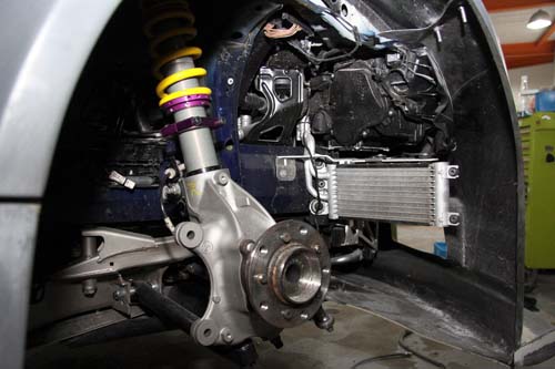 除了前輪底盤結構輕量化,包含車尾也更換輕量化底盤結構以降低重量,此外為了對應兩側向外延伸達100mm的寬體所需,除了底盤下支臂與各式連桿也都換上加長部品,所有採用橡膠材質的結構也全數採用競技魚眼,更為靈敏與直接的轉向反應同時也讓方向機改為賽道1:1的設定,至於後差速器也提前換上Drexler賽道專用。由於對應極端賽道所需懸吊系統直接改為KW Competition 3 Way設定,配合車高與伸縮側阻尼可調設定以符合不同的賽道類型,加上AP Racing前六後四Formula Big Brake Kits與H&R前後防傾桿,全方位提供操控與制動所需。