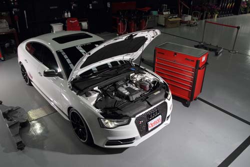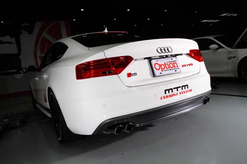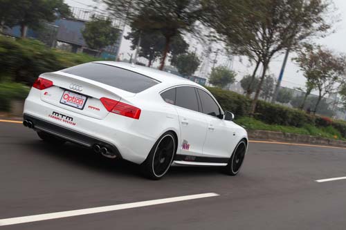 動力方面,S5 Sportback從小改款前,就以所搭載這具引擎排氣量2995c.c.的V6缸內直噴機械增壓引擎,能在5500rpm至7000rpm間釋放333匹的最大馬力,同時於2900rpm至5300rpm間帶來44.9公斤米的扭力峰值,搭配7速S Tronic雙離合器變速箱與Quattro四輪驅動系統,能在5.4秒由靜止加速至100km/h,極速則是被限制於250km/h。據原廠資料顯示,3.0升機械增壓V6引擎較4.2升V8引擎,能夠帶來20%的燃油效率進步,並擁有每公升12.3公里的平均油耗以及每公里190公克二氧化碳排放量之節能表現。相信OP讀者應該都知道,只要原廠搭載增壓引擎,後續改裝潛力就相當深厚,此道理對這部2012年式樣的S5 Sportback同樣適用,尤其面對同級對手BMW 335i的挑戰,豈有不起身迎戰的道理,於是乎找了德國改裝大廠MTM台灣總代理-瑪雅國際的協助,將這部S5 Sportback戰力徹底提昇,使其面對高出二級的對手挑戰依舊游刃有餘。