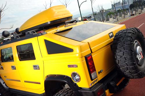 這部H2的身軀到底有多高、多龐大?在加裝Skyjacker車身加高組套件之後,直接將車身高度拉昇了近80公分,這讓原本已經相當高挑的H2更顯得嚇人,如此再加上後廂罩、車頂帳蓬盒以及外掛在車尾的巨大巧克力胎,讓這部H2就像是一棟兩層樓高的房子在道路上行走,且得要連滾帶爬的才能順利地坐進駕駛艙內。而為了讓此部H2更加擁有無堅不摧的驚人越野能力,除了加高底盤與懸吊外,亦換上了Nitto Mud Grappler 20吋越野專用輪胎,來應付極度惡劣路況,也讓整部車的外型更加剽悍,如此再搭配晶亮的駐車燈、車頂標識燈以及強悍的霧燈組,更進一步構築了懾人的氣魄,讓此部改裝悍馬在路上擁有最佳的視覺聚焦能力。