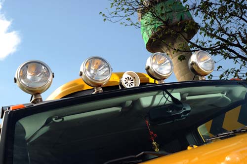 | 車頂與車尾分別加裝了收藏式帳篷盒以及後廂罩,讓整部車更趨龐大高聳。 |