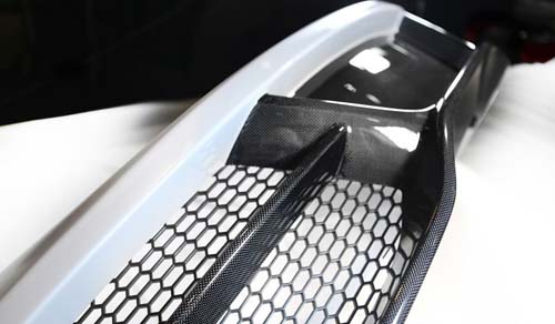 大量採用碳纖維材質所量產的McLaren MP4-12C, 雖然本身擁有極為亮眼的重量馬力比優勢,但是為了持續進化空氣動力學效能RevoZport正式發表更具侵略性的改裝前保桿,從造型上可以看見設有蜂巢格柵的進氣壩配合碳纖維保桿不僅讓重量有效控制在3公斤,進一步提高下壓力與侵略性的外觀則是另一項重點,此外RevoZport同樣也附上擾流版與側裙以高空力效能的完整性。