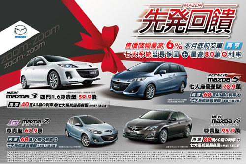 為同步降低消費者購車門檻及養車負擔,MAZDA Taiwan更宣佈針對Mazda2、Mazda3、Mazda5、Mazda6四款車型,推出高額度高期數零利率分期專案,以日本原裝進口豪華跑房車Mazda6為例,提供80萬元60期高額零利率分期,而針對國產中型跑房車New Mazda3,更推出40萬元40期低月付零利率方案,等於月付一萬元即可輕鬆享受New Mazda3人馬一體的極致駕馭感動!