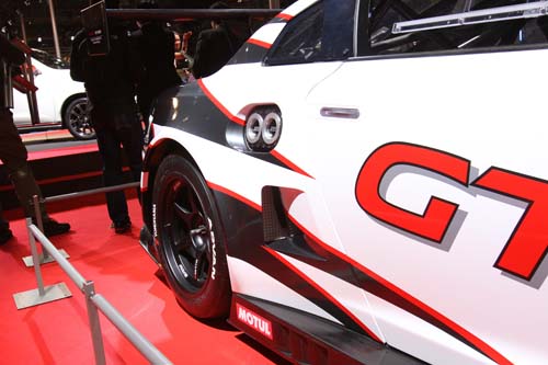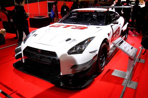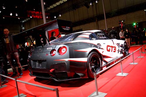極盡張牙舞爪所設計的寬體空力外觀,為了因應GT3賽事與規格所需,Nissan特別推出的賽道板GT-R Nismo GT3可說又將東瀛戰神推向另一發展高峰,在外觀上大量採用碳纖維材質的空力套件包含寬體葉子板、前後保桿、側群與大型尾翼,除了車頭下擾流與定風翼有效維持穩定性與下壓力,大面積的進氣壩也有助於冷空氣快速導入,同時配合引擎蓋散熱孔以利熱氣導出。