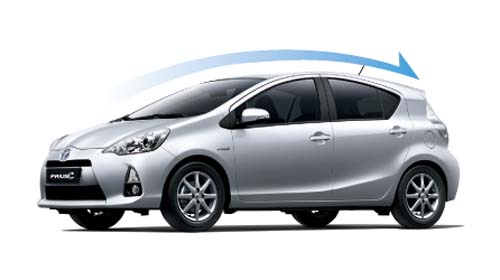 採用Atkinson循環設計及電子水泵的引擎,具有優異的燃油效率,而輕量化的Hybrid變速系統,更能有效減少動力傳輸時的消耗。另一方面,符合流體力學的車身設計,讓Prius c擁有同級車最低風阻係數(0.28 Cd)。這些條件的組合,使得Prius c具備Hybrid車款少有的運動能力。此外,領先同級車4.8m的最小迴轉半徑,讓駕駛者從容穿梭於市區窄巷、車陣當中,即使在有限空間內停車,也能輕鬆上手。EPS電動輔助方向盤,可隨車速調整轉向輔助力,低速輕盈、高速穩定,而定速巡航系統則讓長途高速行駛更省力省油。F1賽車級空力擾流設計,可有效改善車側氣流品質,提昇轉向及高速駕駛的穩定性。