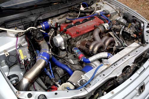 | 由於本車剛完成改裝就來參加測試,連調校電腦的線組都還沒拔掉,因此看起來感覺有點雜亂,但動力可是像怪物一樣恐怖。 |