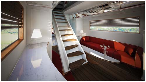 | 車艙內許多設備和空間變化僅需一按鍵便可搞定,譬如在車艙向外延展後,藏在地板下的沙發和桌面便可透過按鈕升起,登上頂篷甲板的隱藏式階梯亦是如此。 |