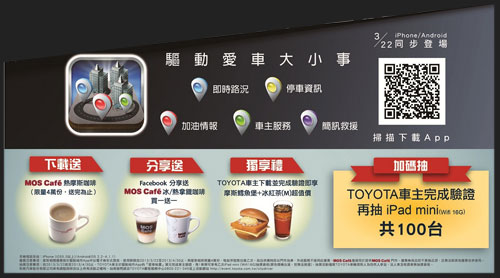 此外,針對現有TOYOTA車主更是大手筆加碼!除了上述優惠外,在4月30日前成功完成App內的車主驗證,即可用超值價格享受摩斯鱈魚堡搭配冰紅茶(M)的組合,同時獲得100台iPad mini(Wi-Fi 16G)的抽獎機會,敬請把握時機!
