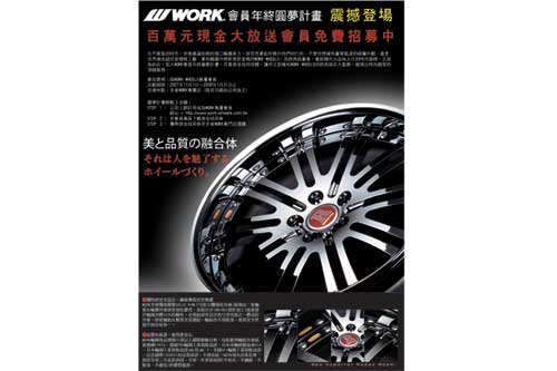 在不景氣的時代,你羨慕滿街跑的進口輪圈車主,卻苦思著如何晉升他們的行列,不管你想擁有豪華氣派的視覺外觀,還是世界潮流超完美的極致工藝。素有輪圈中勞斯萊斯美稱的Work-Wheels,其經典與豪華,最能襯托出品味人士的時尚風格。正因如此,加入Work會員年終圓夢計畫,百萬現金抵用回饋,讓你立即擁有Work-Wheels的經典與非凡氣勢,展現出時尚殿堂的頂級質感。