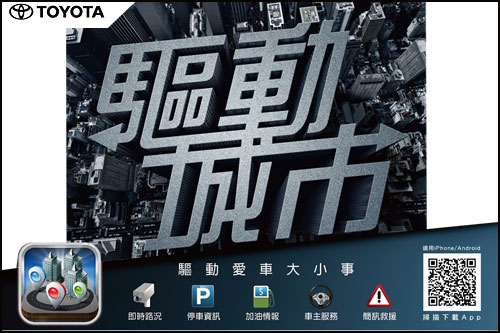 相關TOYOTA『驅動城市』手機App下載及活動詳情,請洽全台TOYOTA展示中心及服務維修據點,亦可至TOYOTA網站(www.toyota.com.tw ),或致電TOYOTA顧客服務中心0800-221-345洽詢。