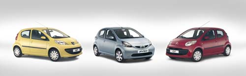 | Toyota、Peugeot與Citroen車廠共同研發的三款「孿生車」:Toyota Aigo、Peugeot 107及Citroen C1共用底盤、大部分構造材料及局部組件。 |