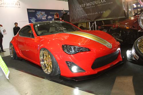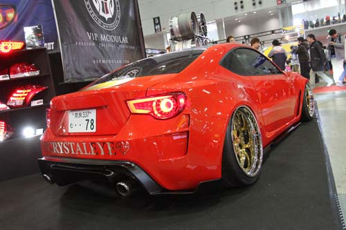 這部GT86最值得注意的地方除了手工寬體化鈑件與排列特殊的頭尾燈組外,還有就是腳踩的四顆24吋純金打造鋁圈。這部由日本專賣LED燈具的Crystaleye,與製造大尺寸多片式鋁圈的VIP Modula,聯合改裝完成的GT86,外觀鈑件單純以原廠零件加以修改,來賦予寬體化的外型,後保桿則更換下半部以擁有大型擾流器,因此視覺張力不若其它空力套件般強烈,不過看到金光閃閃的24吋鋁圈,還是讓人不得不注意其存在。