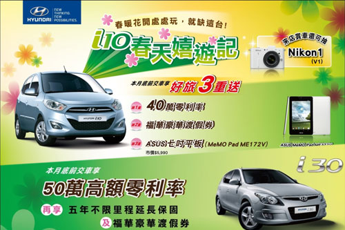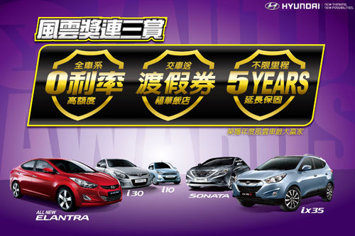榮獲2012奇摩風雲車大賞最多獎項的HYUNDAI,為慶賀成為YAHOO年度風雲車最大贏家再度加碼。本月底(4月)前交車,即享「風雲獎連三賞」三大好禮:全車系高額度0利率、交車送福華渡假券、五年不限里程延長保固,讓消費者春天開新車出遊去。