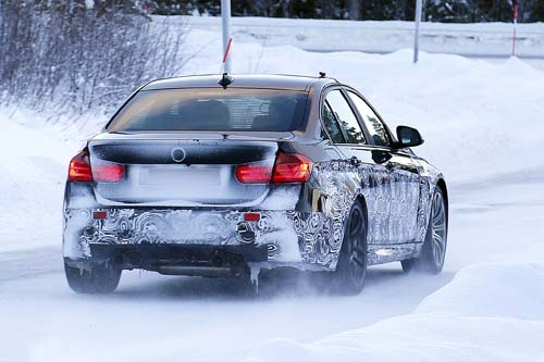 M3測試的間諜照在3系列房車發表後不斷傳出,愈來愈頻繁的軍演幾乎讓我們可以百分之百的相信先前關於M3將於日內瓦車展出現的謠傳是真的,只不過從圖中四片車門隱約透露的訊息,以及即將誕生的4系列Coupe和Convertible打算自立門戶的跡象,M3此世代推出的車款大概不必期待會有雙門和敞篷車型了。將近一年前M3測試車首次曝光到今天,乍看下這部偽裝車似乎沒啥變化,前保桿的氣壩和各部位擾流被掩飾得更徹底,唯一可辨識出的就是象徵競速性格的左右雙出排氣管,以及頭尾燈等新一代3系列特徵;其他像M性能套件的碳纖維陶瓷煞車系統也已換成六活塞卡鉗,而不是先前測試車上所看到的四活塞版。有了微整的外型和相對應的性能化套件,如果能套上三渦輪增壓裝置讓動力系統提昇到450hp最大馬力以上,M3肯定會降低車重來強化加速性,所以我們也可以期待CFRP碳纖維強化複合材料大量運用在車體上。賴震宇+圖/Automdia