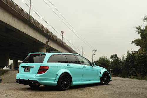 透過JGTC楊老師的車體打造技術,為了建構出自然的寬體線條,在前保桿的部份,該如何拿捏前保下氣口增加尺寸,就是一門學問,加上必須配合整體車體加寬尺寸需求,為了做到整體線條自然散發原有剛烈的肌肉線條,楊老師運用了所有車體改裝技術與材料,做到了最佳輕量化寬體版空力套件,整體氣息上不用太多贅言,就讓人直覺感受到彷如GT廠車的壓迫張力,加上葉子板輪弧開孔點綴之下,更顯出其強烈戰鬥氣息,製作工程進行過程中,每回車主與楊老師進行確認時,都不斷地確認該加寬的輪弧曲線,是否有做到前後切齊要求?加寬尺寸是否達到要求?加寬了輪弧表面曲線是否平滑順暢?會不會烤漆上色後,漆面發生不均的問題?這些問題都在楊老師的努力之下,一一被其克服完成,呈現出眼前這部絕對完美的寬體C63 Estate。