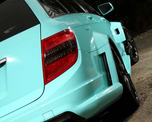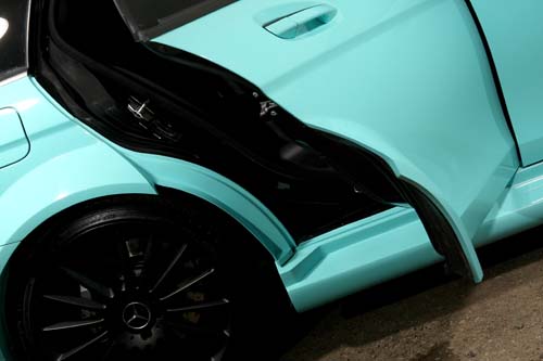 代號『P30』的C63專屬改裝套件,包含了引擎電腦軟體特調、懸吊強化輕量升級、煞車卡鉗制動提升、麂皮方向盤、LSD及內裝質感附件,瞬息間車輛動態表現獲得明顯改善,但這部色彩艷麗的C63 Estate車主可不這樣就滿足了,單就車色來說,就足以證明車主的自我主張意識相當強烈,該車光是在車體建構工程、車色光澤度確認及最終成品再確認,這些繁雜的步驟,就耗費了將近6個月的時間進行,所有細節在車主與JGTC楊老師的討論之下逐步進行,但只要些微細節效果不如預期,就可能面對打掉重做的殘酷下場,或許也是因為這樣的要求與專業,這部寬體C63 Estate在視覺上,有著毫不衝突的順暢感,線條、光澤及質感上都讓人為之驚艷,若是不說很難察覺寬體工程,並非原廠套件建立的吧?