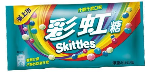 Skittles®彩虹糖全新「什麼什麼口味」系列產品共有5種顏色,並隨意搭配5種水果口味“西瓜、青蘋、草莓、特調水果、藍覆盆子”,打破一般以為草莓就是紅色或青蘋一定是綠色的既定印象,不按牌理出牌的新鮮創意讓消費者無法從糖粒的顏色判斷口味,看到”什麼”不等於吃到”什麼”,這次拿到紅色吃了是西瓜口味,下次吃到紅色可能變成草莓口味,好吃又好玩!讓您在吃Skittles®彩虹糖時總是充滿無限驚喜! 在各通路甫上市後即獲得大家的喜愛,這麼充滿趣味Skittles®彩虹糖的口味名稱就是:「什麼什麼口味」!創造意想不到的話題與樂趣。