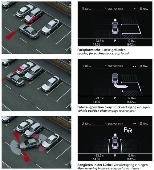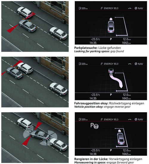 Audi A6領先升級三大頂尖配備中的體感尾門自動開啟功能,可於車主搬卸重物時,在雙手無閒置狀況下,車主可以將感應式鑰匙預先放於口袋或是隨身包包內,並將單腳放置於內建後保險桿內的感知器位置區,系統在自動搜尋感應式鑰匙後,即可將行李廂蓋輕鬆開啟,讓車主迅速地將物品卸放於行李廂中,便捷的貼心設計,十足展現四環品牌進化科技的人本思維;智慧自動停車輔助系統(附環景圖像顯示),則是車輛能自動幫助駕駛者進行小型停車位及轉彎區域的停車,其以超音波感知器搜尋路邊適合的停車位,並針對斜停及平行的停車位進出計算理想路徑,然後自動執行轉向動作,駕駛者僅需附加速及煞車即可。