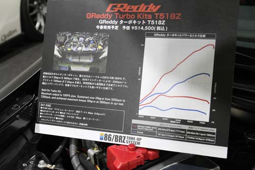 從現場的規格表來看,GReddy打算替GT86所搭載的這顆FA20引擎開發一套街車用的渦輪套件,套件主角為自家的T518Z渦輪,這顆渦輪如果以國內習慣使用號數來推論,大約在6號渦輪左右,能對應的最大馬力約落在400匹,雖然使用在2.0L的FA20上略顯過大,不過也保留了後續昇級的空間。整組套件在引擎腹內零件未強化、保留電子節氣門與原廠塑鋼進氣歧管的條件下,將增壓值設定在0.5bar,可將最大馬力提昇到279.4ps/7141rpm、最大扭力30.1kgm/3800rpm,比對原廠馬力機上的數值173.4ps/6770rpm、19.2kgm/4780rpm,馬力增幅達到106匹,雖然未達怪獸級的動力輸出,不過引擎扭力從3200~7200rpm間都能保持在25kgm的情形下,引擎反應相信會非常迅速而流暢,適合街車改裝使用,目前這組渦輪套件的建議售價為514500日圓,發表日期定在今年第一季,雖然未公布使用電腦為何,不過以該廠成熟的改裝技術而言,推出的渦輪套件應能獲得多數車迷信賴,若有任何進一步消息,本刊必定於第一時間與大家分享。
