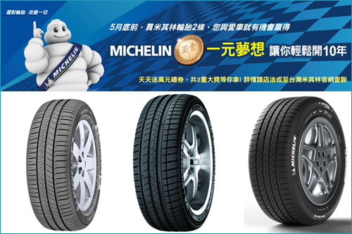台灣米其林輪胎於4月10日宣佈導入MICHELIN Total Performance策略願景後,為使台灣消費者能夠親身體驗米其林的領先科技與輪胎產品的全方位卓越性能表現,台灣米其林將自4月13日起至5月31日止,推出「MICHELIN 一元夢想,讓你輕鬆開10年」活動,為您的愛車選對輪胎,改變一切!