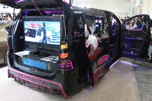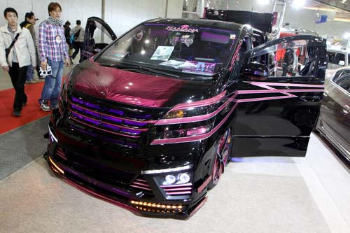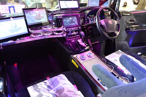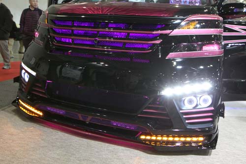 就改裝完整與吸睛程度而言,這輛採用由Hamana所開發的Vellfire空力外觀確實備受不少日本玩家所矚目,不過不只是車頭刻意向下延伸的氣壩與下擾流有效形成視覺張力,源自大燈組開始向後延伸的車身線條,配合LED日行燈與霧燈不僅形成最完整的照明效能,加上氣壩內側的特殊燈色,充分將Minivan龐大的車頭氣勢加以發揮。另外引擎蓋上方的金屬紋路烤漆也是近年所流行的改裝趨勢,加上氣壓式懸吊與訂製輪圈配置,有效呼應極致視覺效果的外觀設計。然而座艙內的鋪陳手法則凸顯VIP風格與極盡般的夢幻奢華,採用與車色配置相同室內氣氛燈,搭配採用麂皮材質的豪華色雙座椅,甚至連頂蓬設計也趨向夜店風格,此外還可以看到車內所搭載的液晶顯示器可有效滿足乘坐時的舒適性與視覺聲光感受。