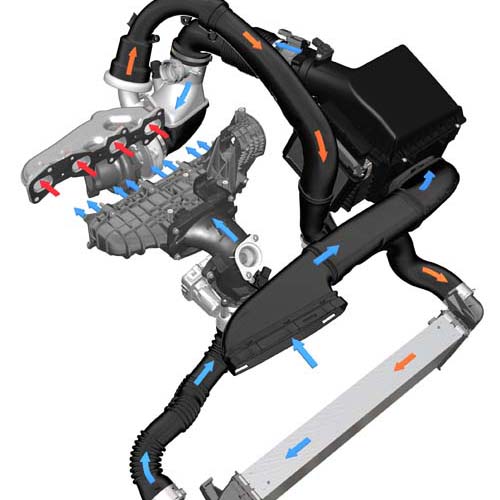 | 為大量引進溫度較低的新鮮空氣,M270引擎透過複雜的進氣管路系統來達成,而體積不大的中央冷卻器就安裝於車頭內,負責冷卻進氣溫度,讓引擎輸出功率保持穩定。 |