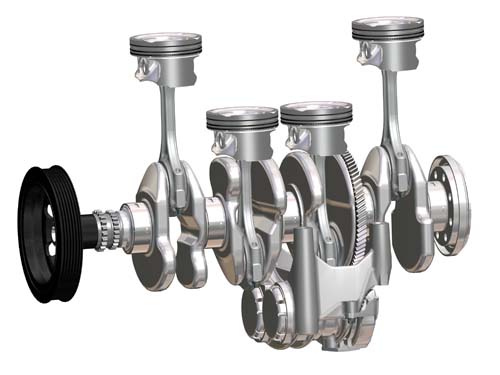 | 為了提高M270引擎的強度,AMG透過全鋁合金曲軸箱、輕量化鍛造曲軸、鍛造活塞與低摩擦係數活塞環等強化零件來達成,而在這張圖中我們也可看到反向平衡軸的設計,目的在減少引擎運轉震動,但相對增加負荷。 |