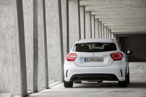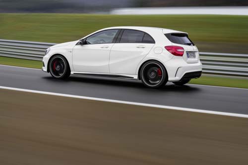 至於搭載這顆引擎的A45 AMG,對於整體戰力有多少提昇呢?為了讓這顆引擎能完全發揮性能表現,M.Benz將AMG 4MATIC四輪傳動系統同時應用在A45 AMG上,在一般情況下這套四驅系統會以前輪驅動車輛以節省燃油,不過位於變速箱中的電腦監測系統,則是會視車速、縱向/橫向加速度、方向盤轉向角度、4輪速差、檔位與油門深淺等資訊,主動調整前後輪扭力分配比例,前後軸輸出比例最多可達50:50四輪傳動設定。而在2.0渦輪增壓引擎、 7速雙離合器自手排變速箱和四輪傳動系統等條件之下,A 45 AMG靜止加速至100km/h僅需要4.6秒,電子限速為250公里,面對同級對手Audi S3的5.7秒、BMW 1 M Coupe的4.9秒,完全無需畏戰,唯一能相互較量的大約只有Audi TTRS的4.5秒。