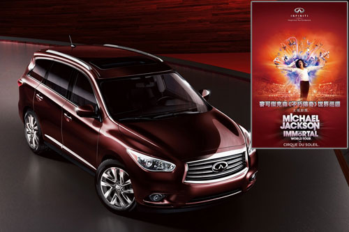 「魅‧力‧無限」INFINITI ─ 兼具魅惑造型「魅」與動感性能「力」的品牌精神,與全球知名藝術團體太陽劇團的表演特色不謀而合,繼2010年贊助太陽劇團「VAREKAI魔幻森林」台灣公演後,INFINITI於2013年再度扮演「THE IMMORTAL麥可傑克森《不朽傳奇》世界巡迴」贊助夥伴,彰顯INFINITI與太陽劇團持續追求極致魅力傳奇的理念。為回饋消費者長期以來對於INFINITI的支持,凡INFINITI車主及試乘貴賓皆可享「麥可傑克森《不朽傳奇》世界巡迴」92折限量購票優惠(註),體驗融合了流行樂天王麥可傑克森的歌曲舞蹈、太陽劇團的創新特技及多媒體舞台設計的傳奇演出。
