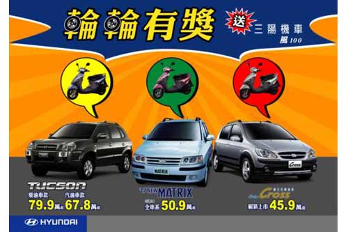 現代汽車為回饋廣大的消費者,特舉辦全車系「買四輪送二輪」,「輪輪有獎」活動,除各車種的友情特惠或零利率方案外,凡購買現代汽車全車系任一車款,再送你三陽機車(風100),讓你四輪二輪一起擁有過好年,詳情請洽全省各大展示間。