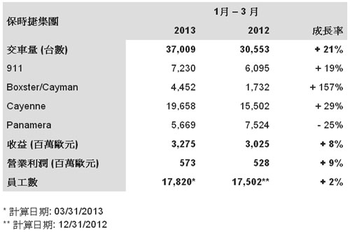 儘管歐洲經濟局勢艱難,德國保時捷汽車公司(Dr. Ing. hc F. Porsche AG)仍在2013 年獲得良好開始。保時捷在 2013 財稅年度前三個月的交車量達到 37,009 輛,足足提高了21%。第一季度的營業收入為 32.8 億歐元,成長率達 8.3 %,創下 5 億 7300 萬歐元的業績,比去年(5 億2800 萬歐元)高出 8.5%。