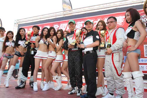 | 飛達輪胎行銷部經理張可仕先生特別親臨現場,與贊助車隊GP1冠軍車手林沅滸一同分享冠軍榮耀。 |