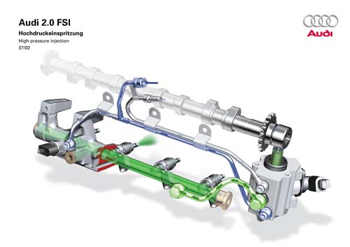 | 由於缸內直噴系統的噴油嘴是直接朝向高壓環境的燃燒室注入燃油,因此噴油壓力需高達180~200bar,才能在極短時間內完成噴油動作,因此油軌結構顯得複雜許多,包含有高壓泵浦、燃油壓力感知器與自動洩壓閥門等。 |