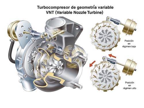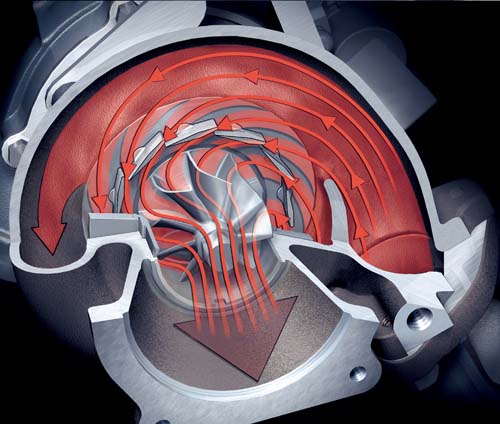 VGT可變容積渦輪增壓科技是透過「雙截式」渦輪排氣扇葉設計,外圈葉片透過角度的調整,控制氣流衝擊排氣葉片的速度,在低轉速廢氣量不足時,縮小廢氣通過的間隙,加速撞擊排氣葉片的氣流速度,進而提昇渦輪轉速,讓引擎在低轉速時,就能擁有極佳的反應;而在高速時則讓葉片張開,讓廢氣有更多的空間可通過,減少排氣頭段內的排氣壓力,並維持渦輪葉片的最高轉速,如此最高增壓值便可持續不墜,且排溫也不會因排壓增加而提高,目前VGT渦輪以廣泛運用在許多高性能渦輪引擎上,成為節能的好幫手。