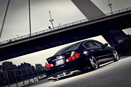 | 遠看你可能很難體會這部Infiniti M35 FUGA低趴之後的精神,深藏前後葉子板的胎壁與葉子板實際間隙僅剩一張名片的細縫,現場操作時車主完全毫不擔心一次到位升降,可見其機件設定有多精準! |
