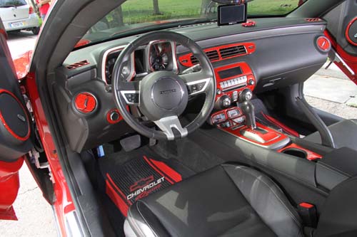 | 內裝的改裝幅度不大,不過為讓內外顏色一致,車主特別從美國購買專車專用的紅色碳纖維飾板貼紙,進行內裝風格的改造。 |