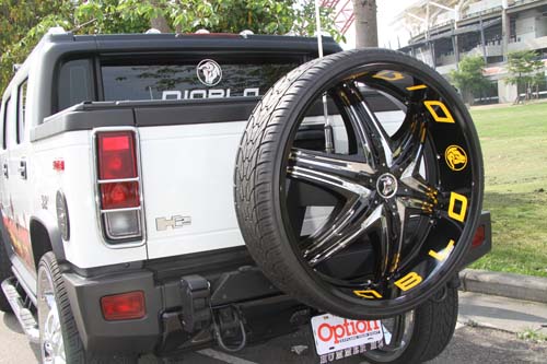 | 這部Humma H2所使用的32吋鋁圈,應該是目前市面上尺寸最大的鋁圈,造型相當醒目,想不注意都很難,完全符合美式改裝精神,而據車主表示,包含輪胎四組胎圈的建議售價高達130萬元,價格之高令人吒舌。 |