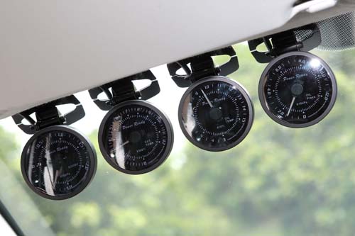 | 為了讓車主可以監控引擎工作狀況,車內追加了四具Power Ready監控儀錶,由左至右分別為增壓、排溫、油溫及油壓錶。 |