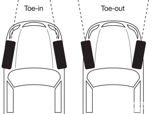 展哥認為,外傾角的調整對於車輛的操控來說固然重要,但是前束值才是車輛在彎道中表現的關鍵,所謂前束值就是從車輛正上方看過去左右二輪與行車方向所形成的夾角,二輪完全平行沒有角度前束值為0度,若二輪延伸的夾角在車頭方向為正角(In),而反之則為負角(Out),絕大多數的車輛前束值都是採用前後皆In的正角度,直線行駛時輪胎因為慣性會將前束值拉到0度左右,這樣車輛在高速行駛才不會造成左右偏移的狀況。