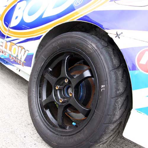 | 告訴大家一個常見的錯誤觀念,很多人認為雨天不能使用熱熔胎,事實上由於熱熔胎的工作溫度上來的比街胎還快,除非雨大到路面積水,否則在賽場上熱熔胎的雨天成績還是比街胎快。 |
