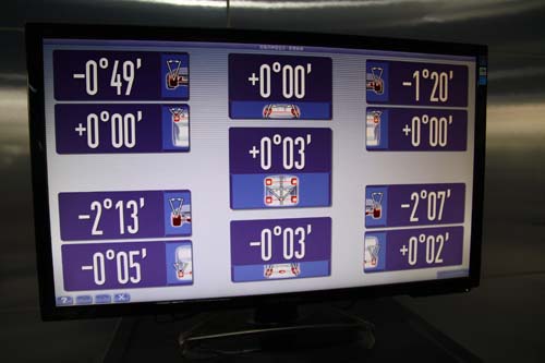 | 電腦定位儀器能夠將車輛各項角度即時顯示出來,例如Camber、Toe及Caster等,以提供技師進行調整。 |