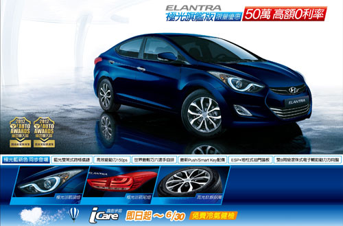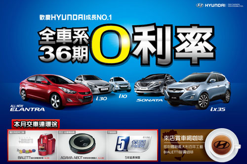 輕鬆負擔購車,HYUNDAI推出了全車系高額0利率,更將購車分期的期數拉高至36期,除讓消費者月付低負擔外,更直接省下三~五萬多元的利息費用,且還能讓消費者能夠以更輕鬆的頭款來購得喜愛的車款。HYUNDAI ix35全車系本月(6月)底交車,享60萬36期0利率。ELANTRA 及i30全車系本月(6月)底交車,享高額度50萬36期0利率;i10車系本月(6月)底交車享高額度40萬36期0利率。
