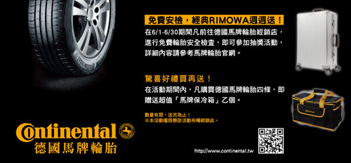德國馬牌輪胎提醒所有車主,萬萬不可忽視胎溝深度不足的情況,若胎溝深度低於1.6mm時,建議要立刻更換輪胎,避免在濕滑路面產生打滑失控的危險。此外,行車前要檢查胎壓維持在正常值,其操控性能、輪胎磨耗、油耗表現和安全性才能發揮最佳效能。現在,只要於活動期間內(2013/6/1~6/30)至德國馬牌輪胎全台經銷店進行輪胎免費安全檢查,就可參加「經典旅行箱RIMOWA抽獎活動,每週都會抽出三個幸運車主,獎項除RIMOWA旅行箱之外,還有RIMOWA旅行包等將近一千個額的馬牌精品好禮要送給您,詳細活動內容,請參考德國馬牌輪胎官網或活動網站http://mycontinental.tw。