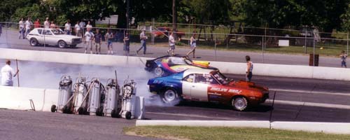 | 直線賽的熱血標準景象,就是演出燒胎動作,這是為了預熱輪胎讓橡膠融化,以增加抓地力。 |